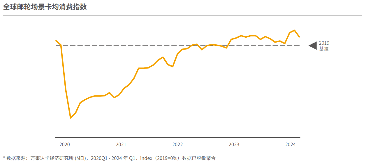 2024 年伊始,全球消费者跨境出行人数及旅行支出均增速强劲。2024 年第一季度全球机票及邮轮消费指数均显著超越疫情前水平,其中邮轮交易量比 2019 年同期高出16%[2]。