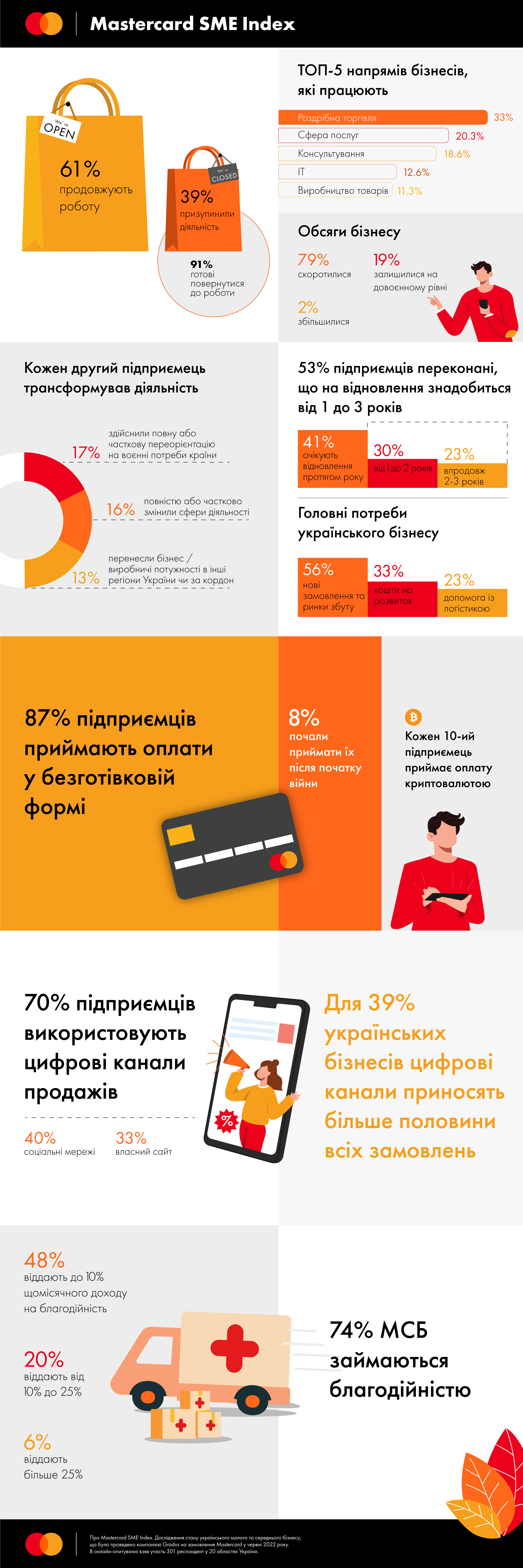 Київ, 1 серпня 2022 р. – Більшість українських підприємців (61%) попри війну, вимушену релокацію, складнощі з логістикою та зменшення обсягів продажів продовжують працювати, а 91% з тих, хто призупинив діяльність – готові відновитись у майбутньому. Такі результати дослідження Mastercard SME Index, у рамках якого вивчалися стан та ключові потреби малого та середнього бізнесу в Україні, а також перспективи повернення до показників довоєнного рівня.