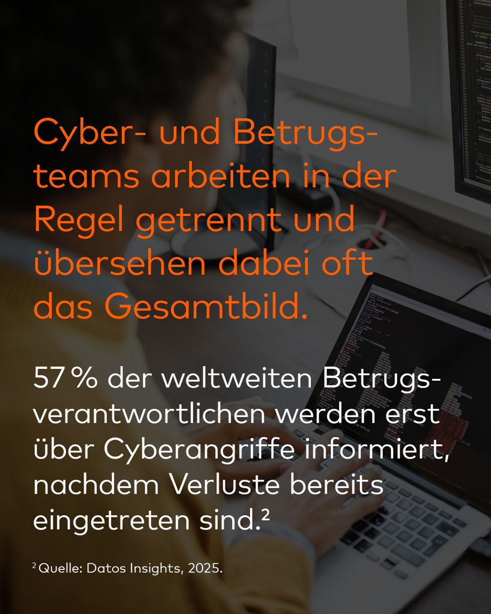 Betrug entsteht selten bei einer Transaktion – oft hat er seinen Ursprung in einem Cyberangriff. 57 % der führenden Betrugsexpert:innen weltweit berichten, dass sie erst dann von Cyberangriffen erfahren, wenn bereits finanzielle Schäden durch Betrug entstanden sind 1). Zahlungsbetrug ist für die entsprechenden Teams längst nicht mehr nur ein finanzielles Problem, sondern vielmehr ein Cybersicherheitsproblem, das sich unmittelbar auf den Unternehmenserfolg auswirkt. Mastercard Threat Intelligence schließt Kommunikationslücken und ermöglicht es Betrugs- und Sicherheitsteams, nahtlos zusammenzuarbeiten, um Betrug frühzeitig zu erkennen und zu verhindern.