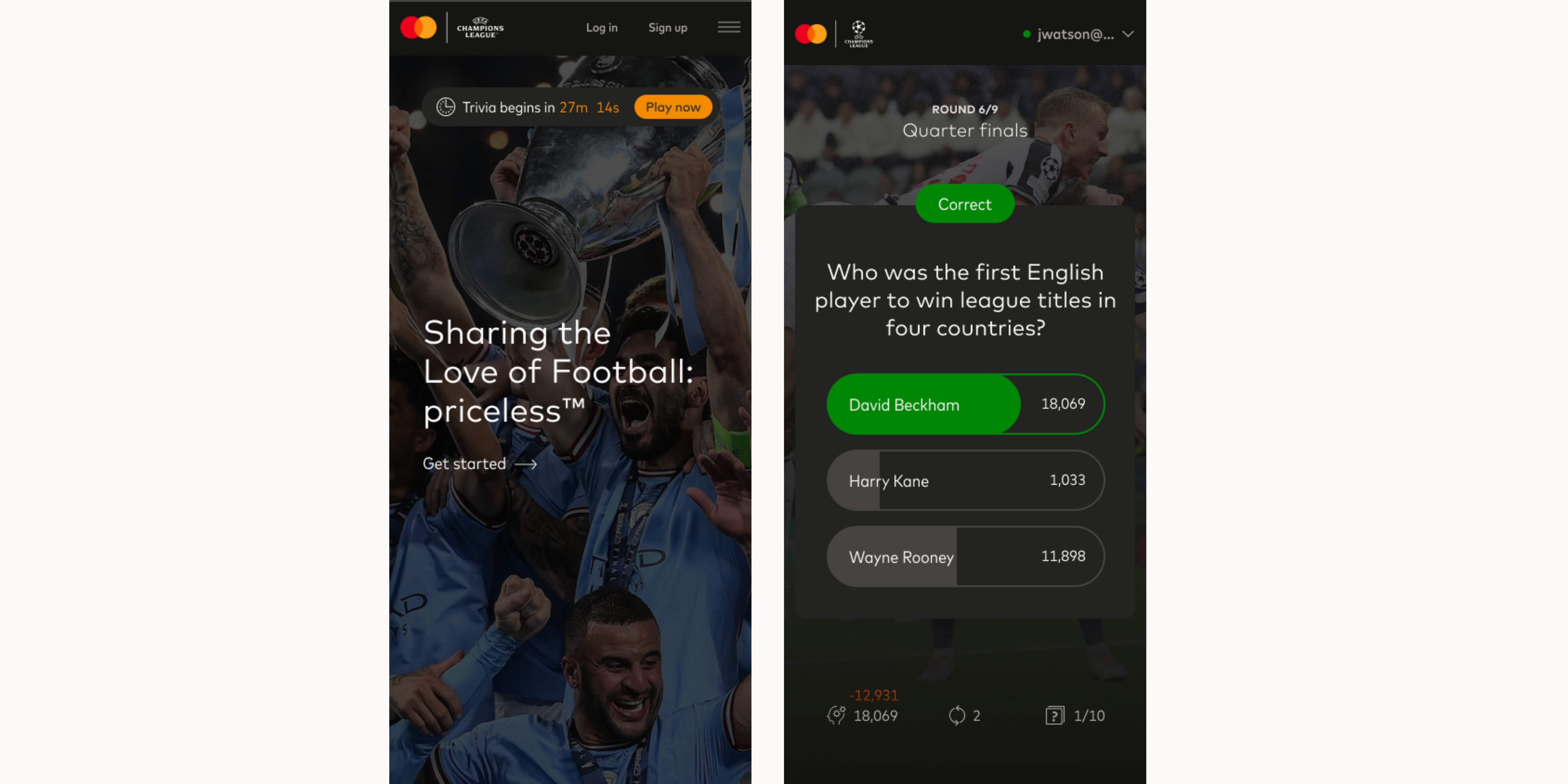 Throughout the 2023/24 UEFA Champions League tournament, Mastercard cardholders across France, Spain, Germany, UK, Italy, USA, Mexico, Colombia, Brazil and Argentina will be able to compete in a real-time football-focused quiz, answering questions from the highest scoring game[3] to the year the first-ever Group Stage took place[4].