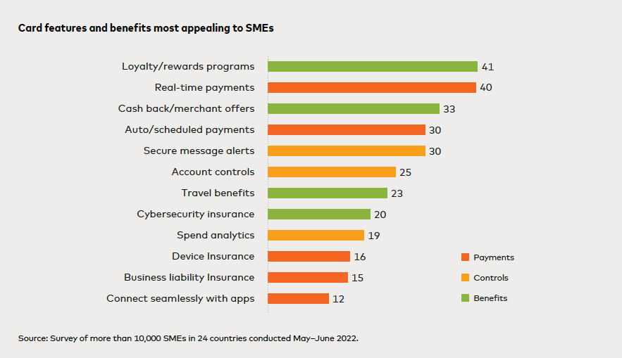 Despite the wide range of payment solutions available today, SME payments are still dominated by cumbersome bank transfers and risky cash. And many SMEs that do use credit or debit cards primarily rely on personal products, not business cards. Yet today’s innovative business accounts offer benefits and services designed to help them build their business, such as dynamic and higher lines of credit, tailored offers and rewards and financial management tools.