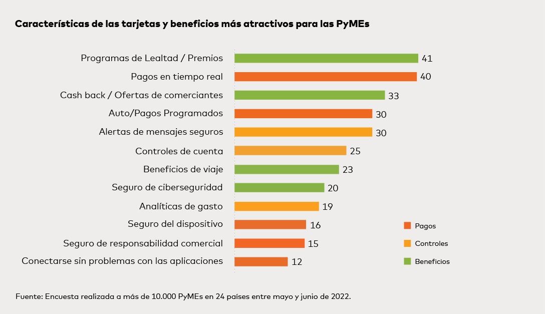 A pesar de la amplia gama de soluciones de pago disponibles hoy en día, en los pagos de las PyMEs todavía preponderan las transferencias bancarias y el efectivo dudoso. Y muchas PyMEs que usan tarjetas de crédito o débito, lo hacen con tarjetas personales y no de empresa. Sin embargo, las innovadoras cuentas comerciales de hoy en día ofrecen beneficios y servicios especialmente diseñados para ayudarles a armar su negocio, como líneas de crédito dinámicas y más amplias, ofertas y premios personalizados y herramientas de gestión financiera.