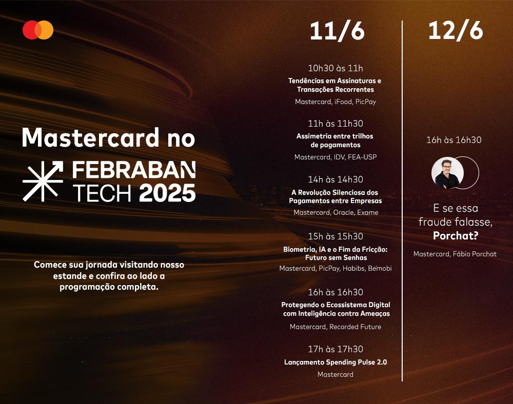 A Mastercard participa do Febraban Tech 2025 com uma programação voltada à inovação e segurança nos meios de pagamento. A agenda inclui um painel no palco principal com o apresentador e humorista Fábio Porchat e, pela primeira vez, uma série de sessões temáticas conduzidas por executivos da empresa e especialistas convidados integram a programação oficial do evento, no dia 11 de junho.