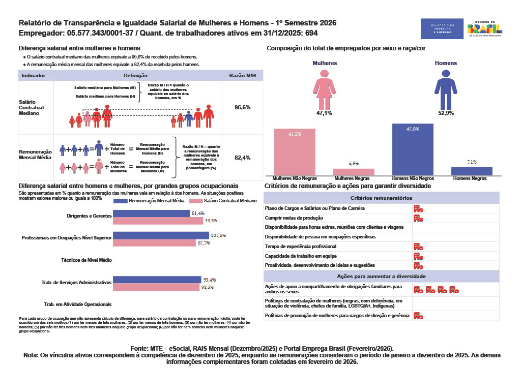 O relatório não compara profissionais na mesma função, não analisa tempo de serviço na organização e na respectiva função, bem como não considera diferenças de desempenho entre profissionais. Estamos certos de que, em uma análise adequada de nossos dados, não há diferenças salariais injustificadas entre nossos profissionais. De qualquer forma, em observância à legislação e ao nosso compromisso com a transparência, publicamos abaixo o relatório do MTE.
