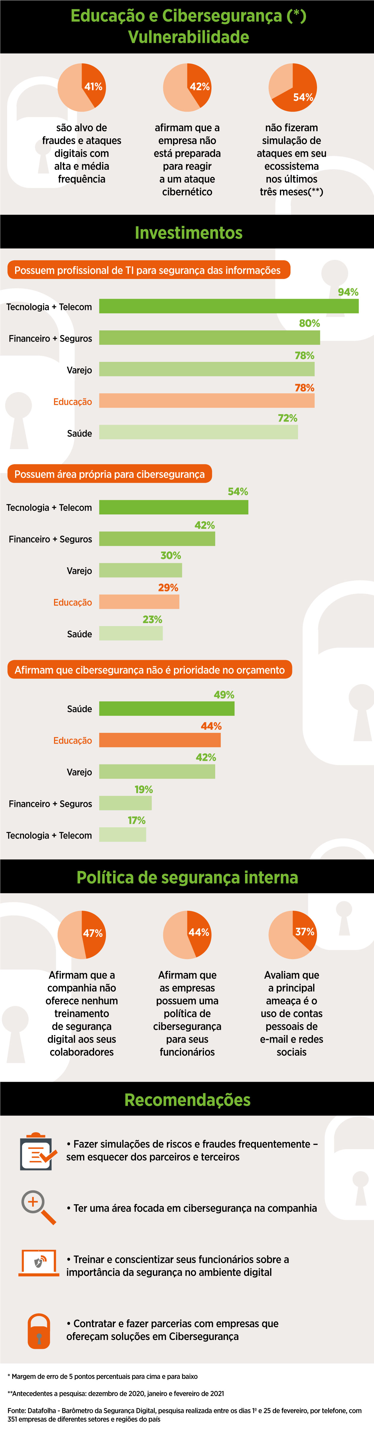O resultado mostrou que as empresas, principalmente as do setor de educação, têm muito a evoluir em termos de segurança de dados: 35% dos entrevistados disseram que cibersegurança não é prioridade nos orçamentos e planejamentos futuros para a companhia, segundo maior percentual entre os setores pesquisados (veja infográfico).