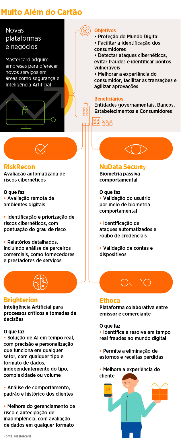 Como parte da estratégia de ir além dos cartões, a Mastercard iniciou uma série de aquisições de empresas de tecnologia. A companhia oferece hoje soluções que vão de segurança de dados e detecção de risco de fraudes a ferramentas que facilitam as transações financeiras para auxiliar empresas grandes ou pequenas a gerir seu capital e inovar na tomada de decisões de negócio.