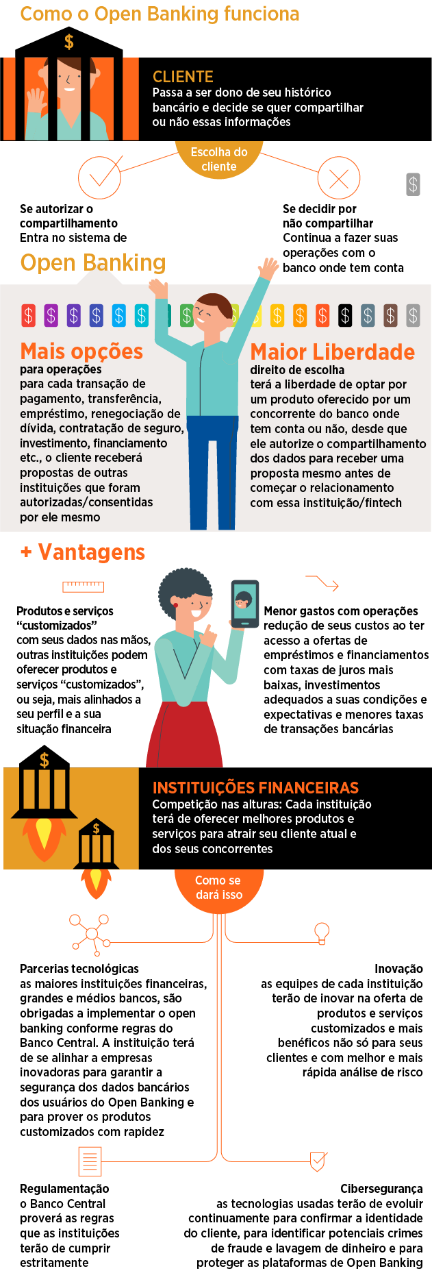No Brasil, o Open Banking deverá estar disponível a partir de novembro de 2020, quando inicia a primeira fase da regulamentação publicada pelo Banco Central. Pessoas físicas e empresas passarão a ter acesso pelo celular ou computador a um universo de produtos e serviços financeiros customizados, ou seja, construídos especialmente com base em seus perfis. Eles serão oferecidos pelo banco onde tem sua conta e também por outras instituições, sem precisar se tornar correntista delas. A escolha sobre qual oferta atende melhor a suas condições e expectativas será exclusivamente do cliente.
