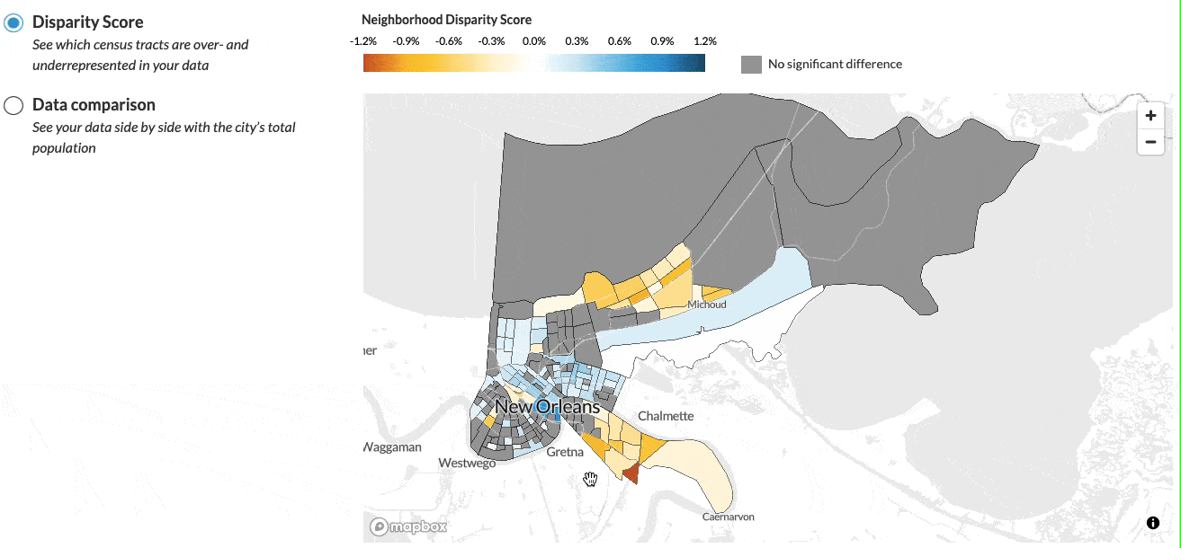 The Spatial Equity Data Tool allows users to upload their own city-level location data (such as the locations of WiFi hotspots, bike-share stations and 311 requests for pothole or sidewalk repairs) to quickly assess whether all neighborhoods and demographic groups are equitably represented in the data. When we used the tool to analyze 311 requests in New Orleans from 2014 through 2018, we found that white residents were 4.4% overrepresented in the neighborhoods where 311 requests are located, and Black residents were 3.9% underrepresented. Audits like these can help cities target outreach to underrepresented neighborhoods and raise key questions about how to equitably use resident-request data like 311 requests to inform service delivery.