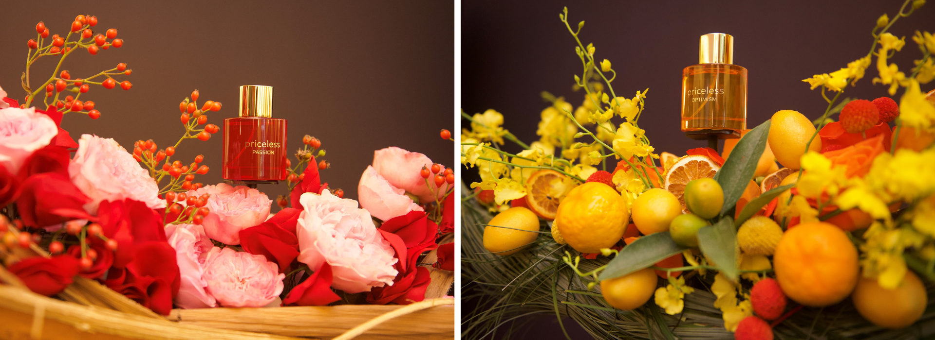 For Priceless Optimism, Baghriche chose the earthy root vetiver, sourced from Haiti, which smells like fresh-cut grass. She combined that with Sicilian orange, grapefruit, mandarin and rhubarb to create an uplifting, invigorating scent for the yellow fragrance.