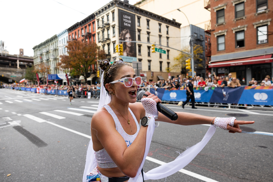 Alexi Pappas takes over the mic at the mile 16 Cheer Zone. (Photo credit: Jonathan Heisler)