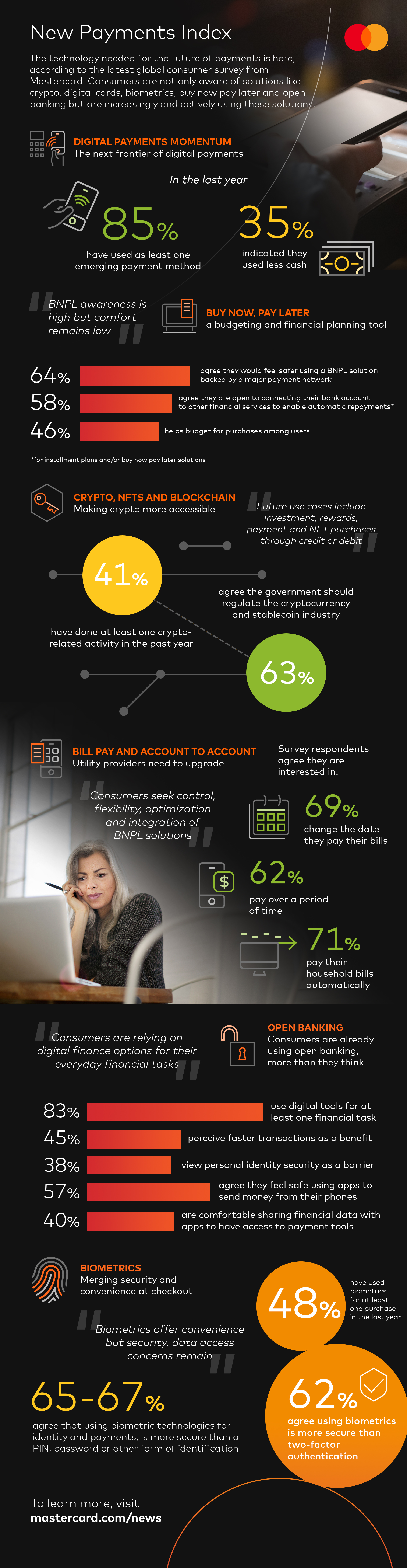 Direct bank account payments. Buy now, pay later plans. Money transfer apps. Crypto, QR and wearables payments. Eighty-five percent of people say they used at least one emerging digital payment method in the past year, according to a global consumer survey of 35,040 respondents in 40 countries conducted by the Harris Poll and Mastercard. An overwhelming 93% say they are likely to use one of these methods in the next year.