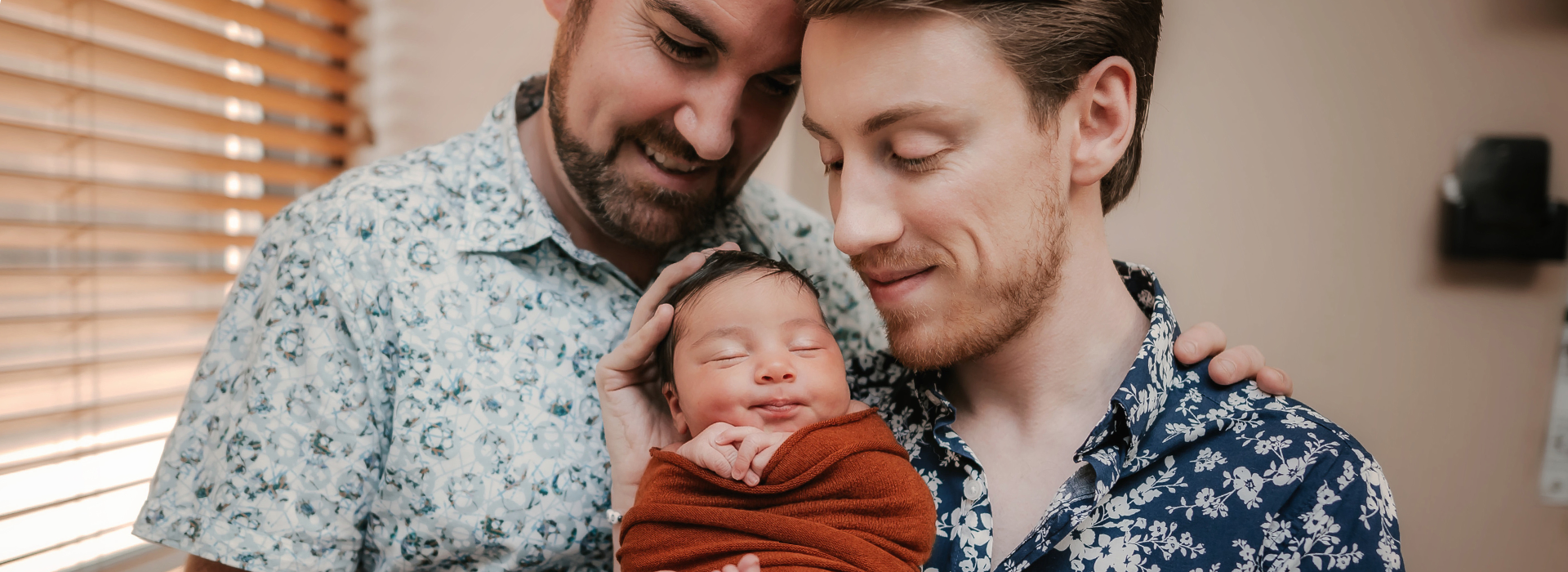 Banner photo: Mark O'Looney, right, with husband Eoin Cannon and their newborn daughter Aria. (Photo credit: Elise Hurst/Woven Photo)