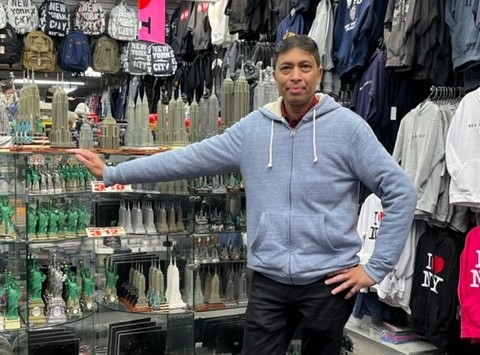 “The tourists are coming back,” says Kazi Murshed, above, who owns a souvenir shop around the corner from Broadway’s “Wicked” performances at the Gershwin Theatre. “But we only have about 15% of the international visitors from before the pandemic.” He relied on visitors from abroad to buy his merchandise, a hodgepodge of New York City T-shirts, taxi-shaped keychains and Empire State Building trinkets.