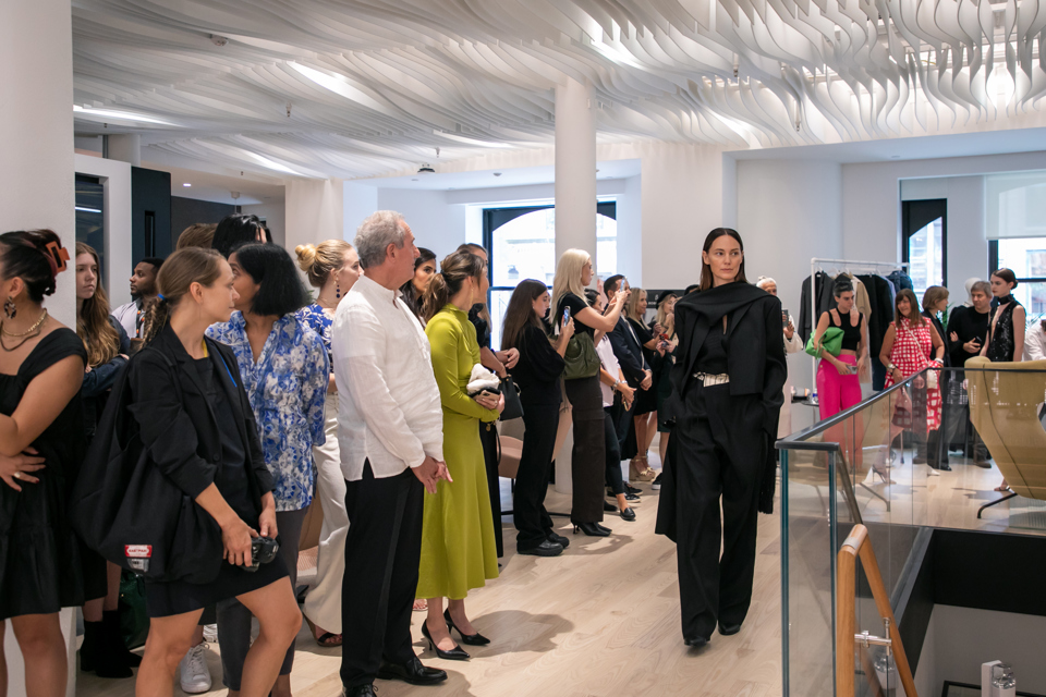 A model in a pantsuit from the Ukrainian brand Gudu walks the impromptu runway at Tuesday's presentation featuring six designers from the war-torn nation. (Photo credit: Rebecca Abraham)