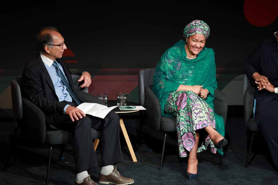 Amina J. Mohammed, deputy secretary-general of the United Nations and chair of the U.N. Sustainable Development Group, right, joined a panel on the intersection of power and purpose with moderator Homi Kharas, a senior fellow at the Center for Sustainable Development at Brookings, left. Prime Minister Mia Amor Mottley of Barbados also spoke about her work in climate action and finance reform. (Photo credit: Valeria Verastegui)