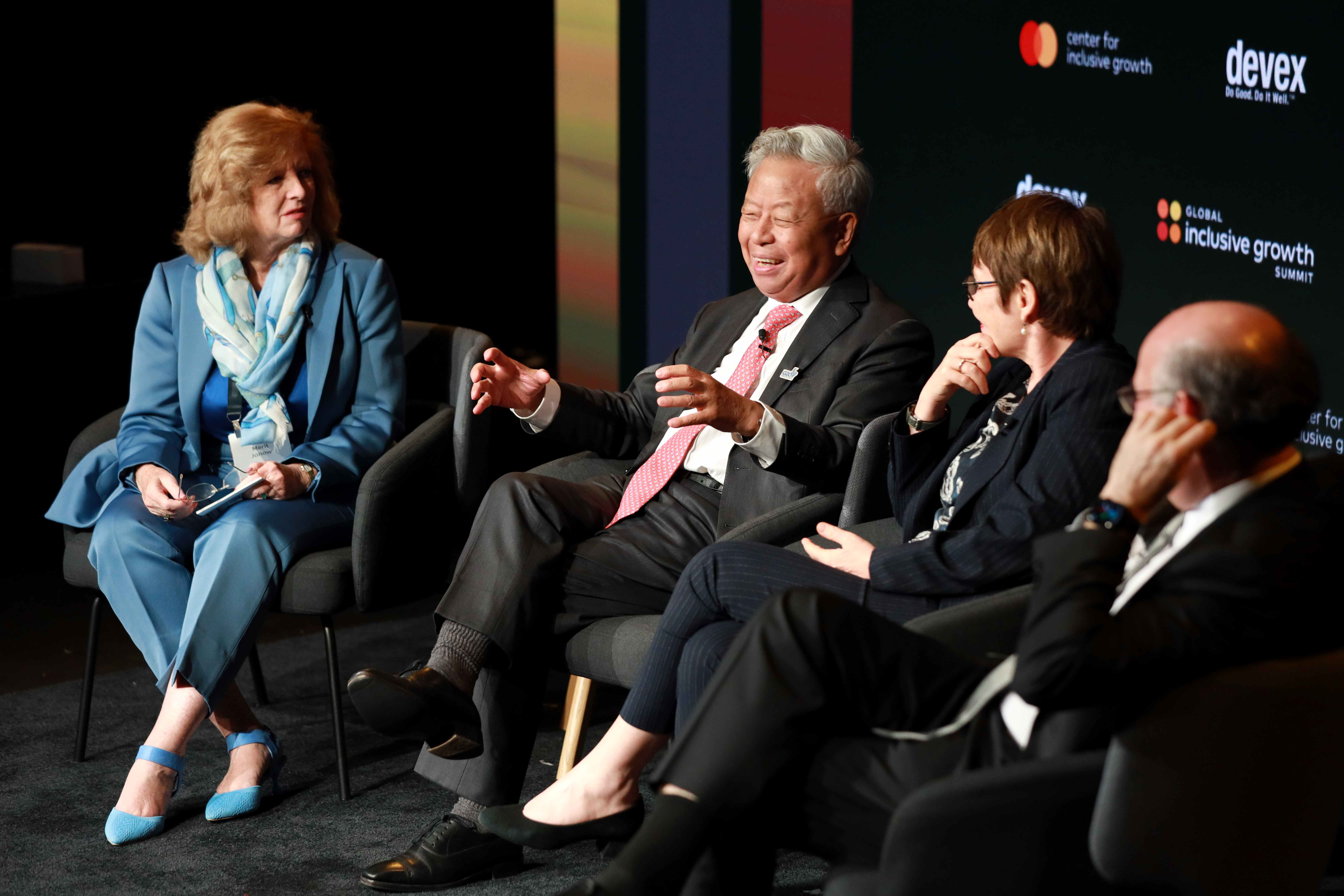Mastercard Board of Directors Chair Merit Janow, left, convened a panel of multilateral development bank leaders to discuss how they can adapt to and collaborate in an evolving development landscape. From second from left, Jin Liqun, president of the Asian Infrastructure Investment Bank, Odile Renaud-Basso, president of the European Bank for Reconstruction and Development, and Ilan Goldfajn, president of the Inter-American Development Bank.