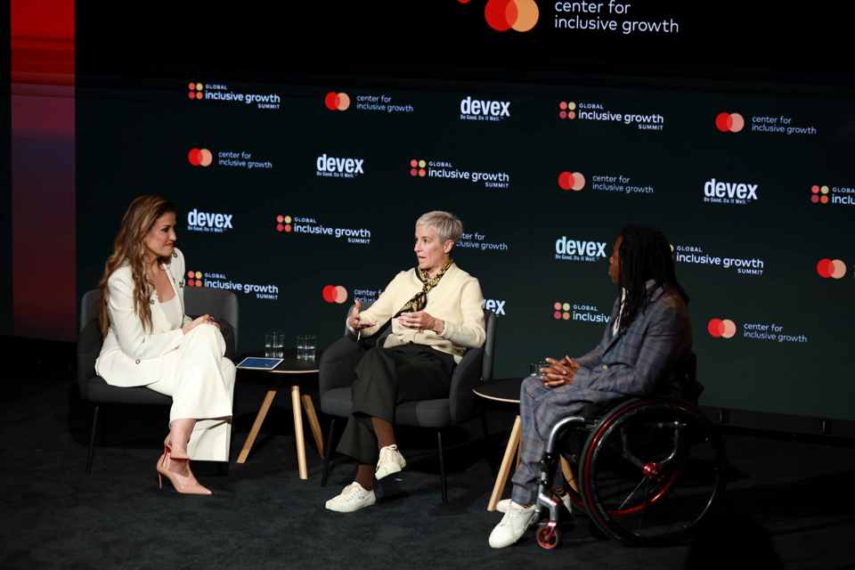 Soccer star Megan Rapinoe, center, and paralympic medalist (and summit co-host) Ade Adepitan, right, discussed the power of sport to drive positive change, along with Adepitan's co-host Andréa Vieira, left. (Photo credit: Valeria Verastegui)