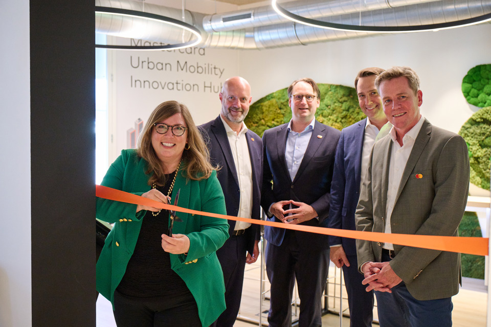 Mastercard's Chief Sustainability Officer Ellen Jackowski cuts the ribbon for Mastercard's new urban mobility center in Amsterdam, with, from left to right, Nic Villa, executive vice president for the public sector; Jan Willem Van der Schoot, Netherlands country manager; Chapin Flynn, global head of urban mobility; and Friedo van Gelder, vice president for urban mobility.