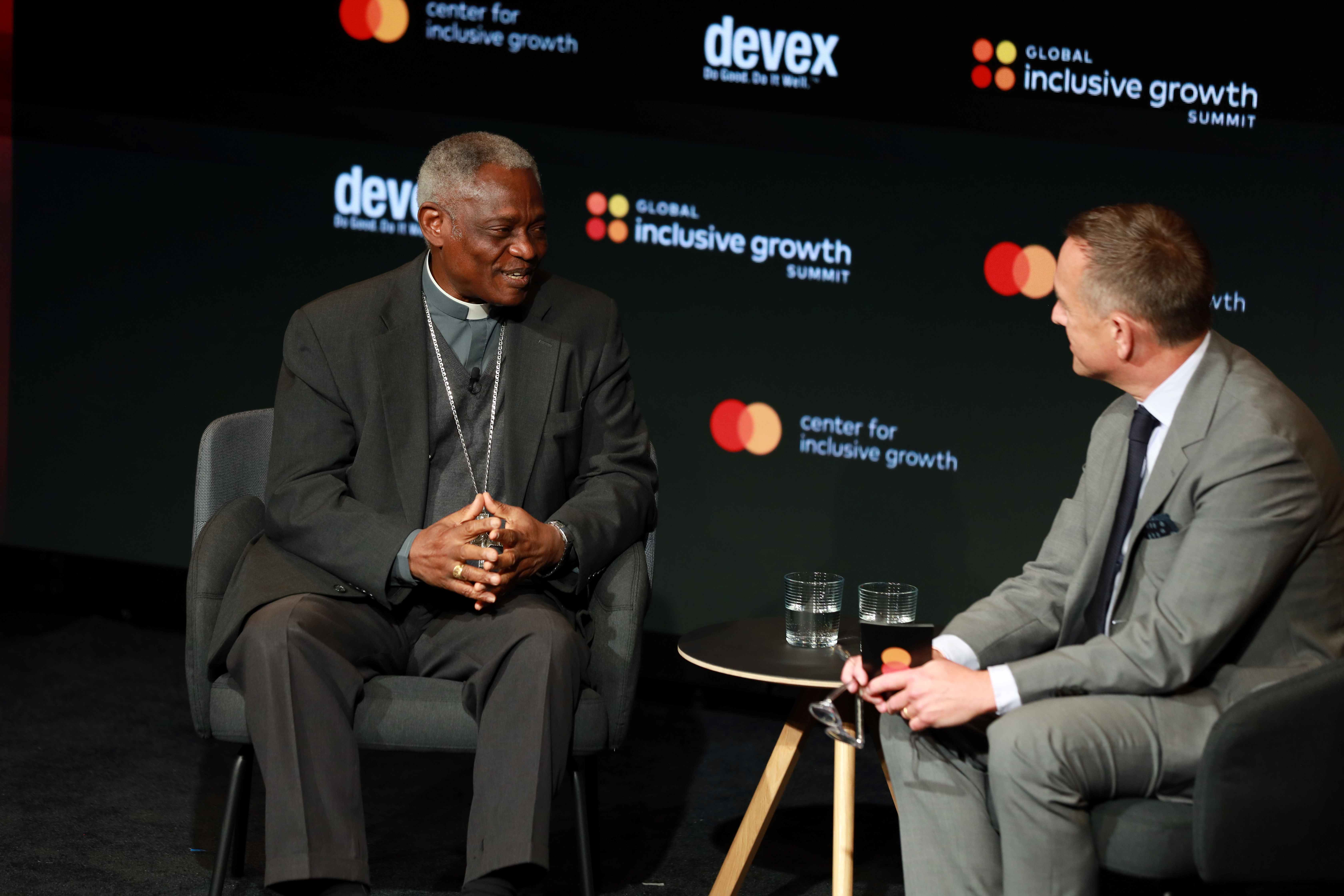 Top left, from left, Mastercard CEO Michael Miebach and Makhtar Diop, managing director of the IFC, at the 2023 Inclusive Growth Summit; top right, Mastercard Americas President Linda Kirkpatrick and Nubank co-founder Cristina Junqueira at the 2024 summit; bottom left, disability advocate Ade Adepitan and 2023 summit host Trevor Noah; and bottom right, Cardinal Peter Kodwo Appiah Turkson and Mastercard Chief Administrative Officer Tim Murphy, at the 2024 summit.