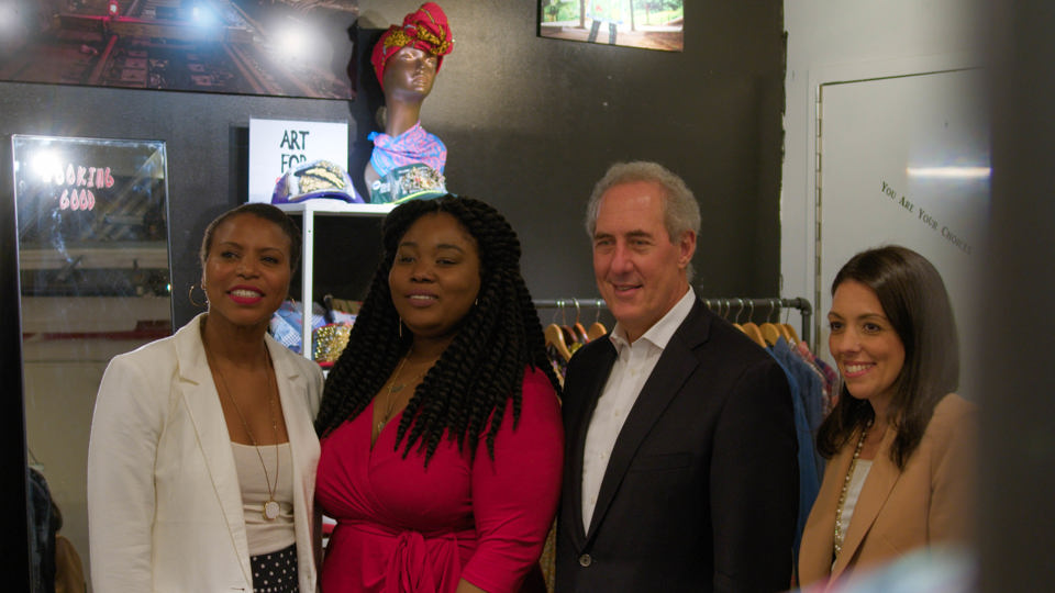 Mastercard's Michael Froman, right, vice chairman and president, Strategic Growth, and Linda Kirkpatrick, president, North America, left, visits Da Spot, where owner Michelle Cadore talks about what inspired her to open her shop and how it has become a hub for other creatives in the area.