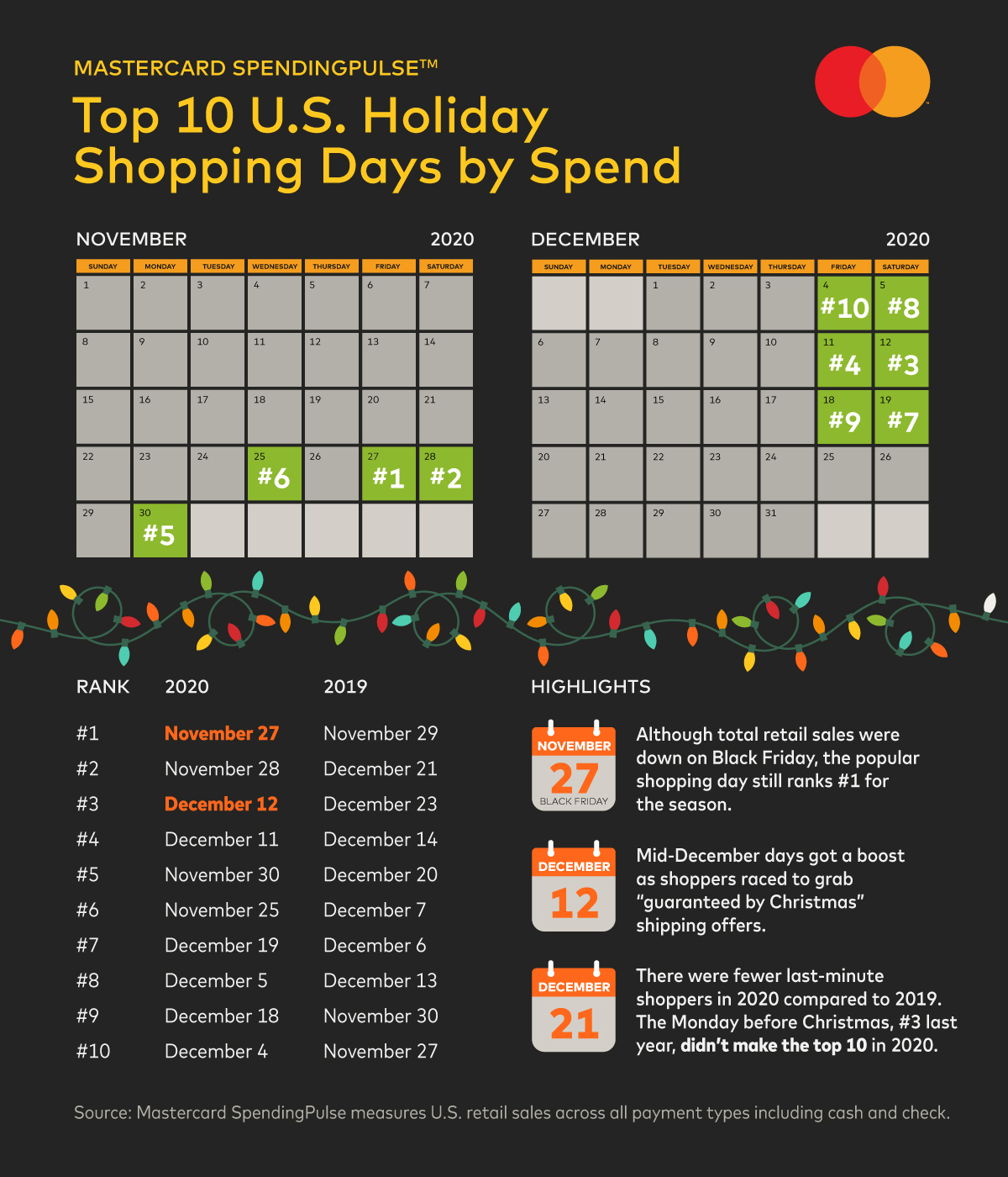 Mastercard SpendingPulse defines “U.S. retail sales” as sales at retailers and food services merchants of all sizes. Sales activity within the services sector (for example, travel services such as airlines and lodging) are not included. Holiday spending insights are preliminary.