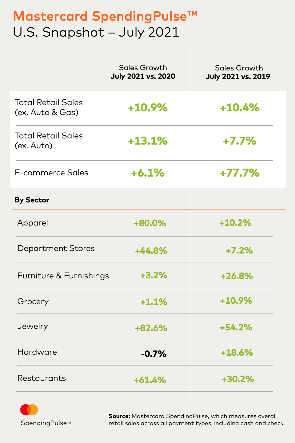 “While e-commerce continues to play an increasingly significant role for retail, nothing replaces the in-store experience,” said Steve Sadove, senior advisor for Mastercard and former CEO and Chairman of Saks Incorporated. “July numbers reflect a return to the store. Consumers are shopping, spending and splurging across channels.”
