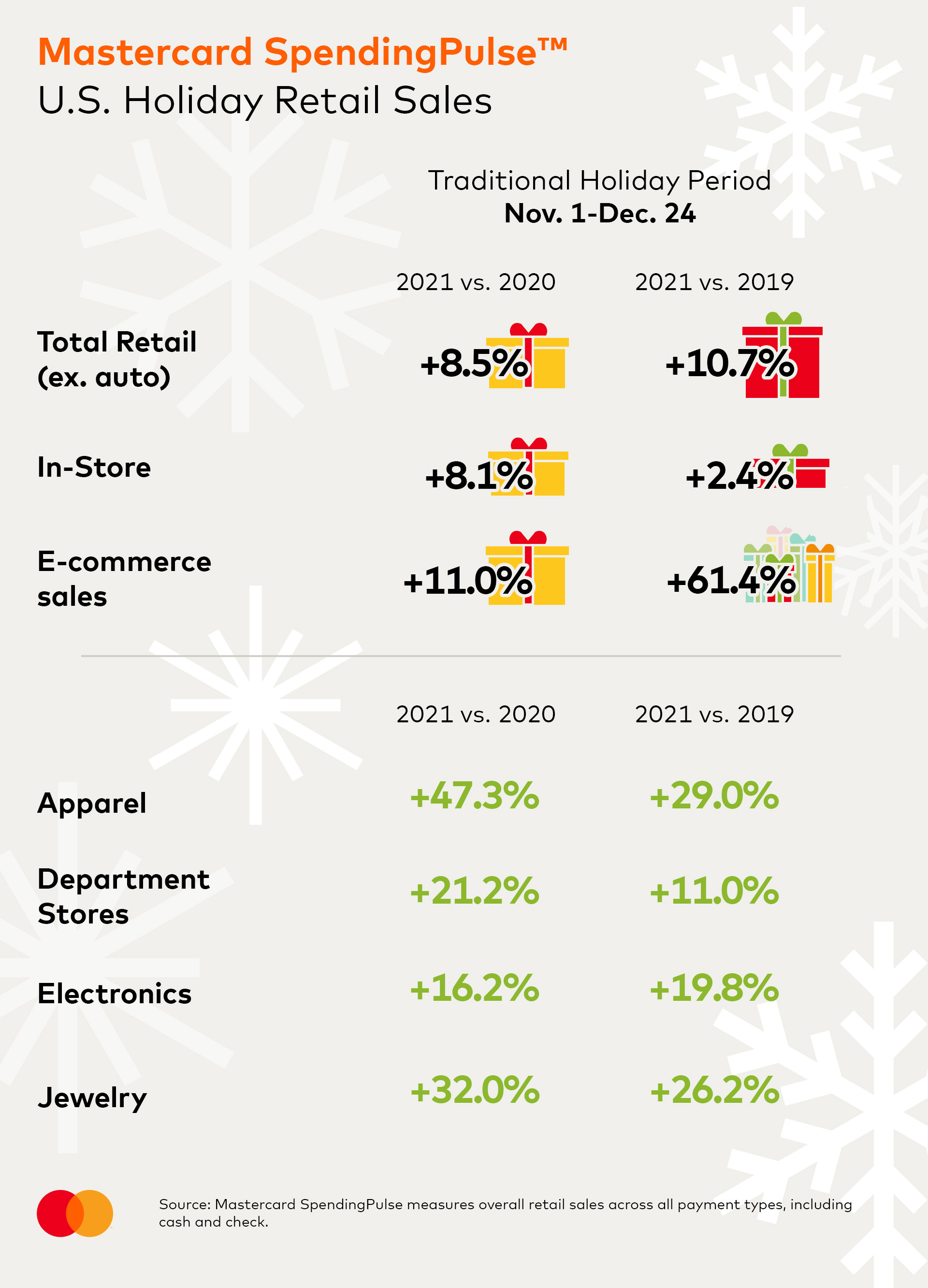 Findings from Mastercard SpendingPulse underscore the strength of the holiday shopper across channels, with consumers returning to stores (+8.1% YOY), and e-commerce continuing to expand, up 11.0% compared to 2020. Additional key findings include:
