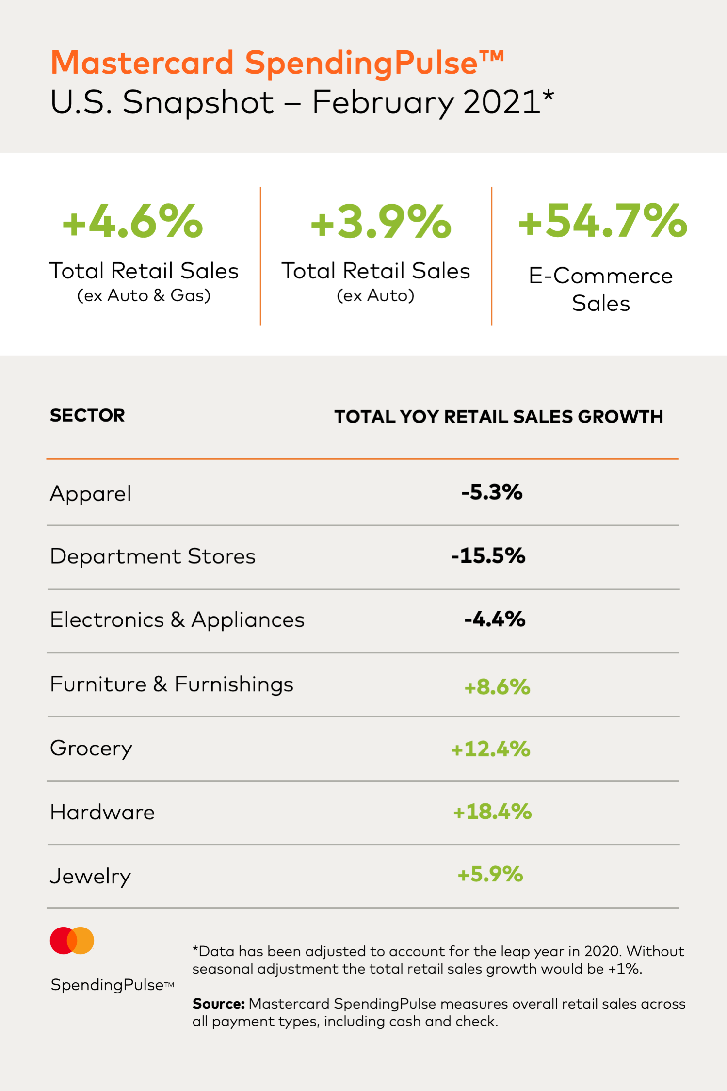 Despite the inclement weather felt across many parts of the country this February, U.S. retail sales excluding automotive and gasoline increased 4.6%* year-over-year when adjusted for Leap Year, according to Mastercard SpendingPulseTM. Online sales grew 54.7% compared to 2020. Mastercard SpendingPulse measures in-store and online retail sales across all forms of payment.