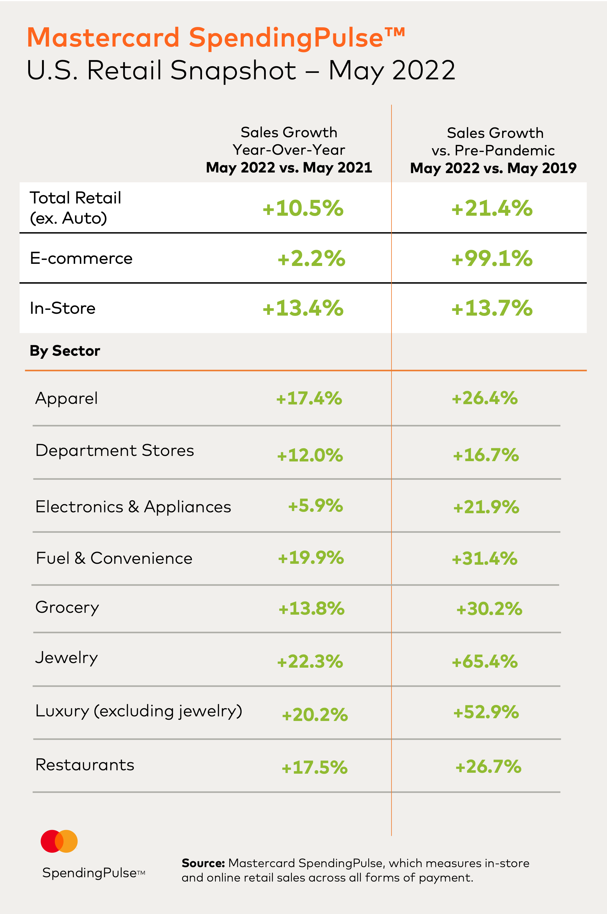 According to Mastercard SpendingPulse, total U.S. retail sales excluding automotive increased 10.5% year-over-year in May, and 21.4% compared to pre-pandemic May 2019. This is outpacing YOY monthly growth experienced thus far in 2022. In-store sales were a key driver, up 13.7% compared to pre-pandemic levels.