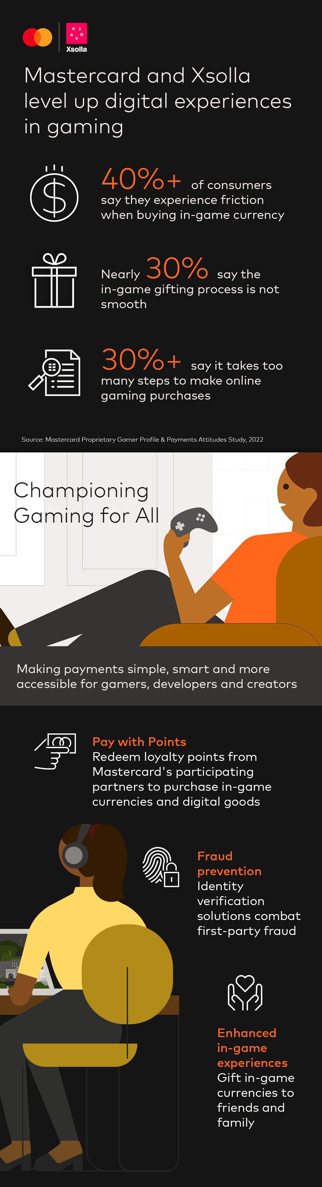 Today Mastercard and global video game commerce company Xsolla announced plans to collaborate on frictionless, secure, and rewarding payments for gamers – from enhanced checkout experiences using credit card loyalty points[1] to simple in-game currency gifting to improved creator payout processes and more. The partnership will combine Mastercard's technology, network-level expertise, global scale, and trusted connections with Xsolla's platform to create customizable and more accessible payment experiences for players, developers, and creators.